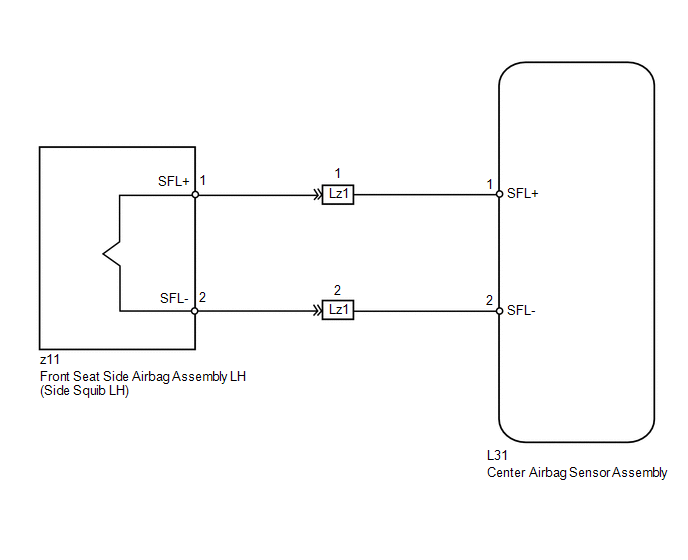 The side squib LH circuit consists of the center airbag sensor assembly and front seat side airbag assembly LH.